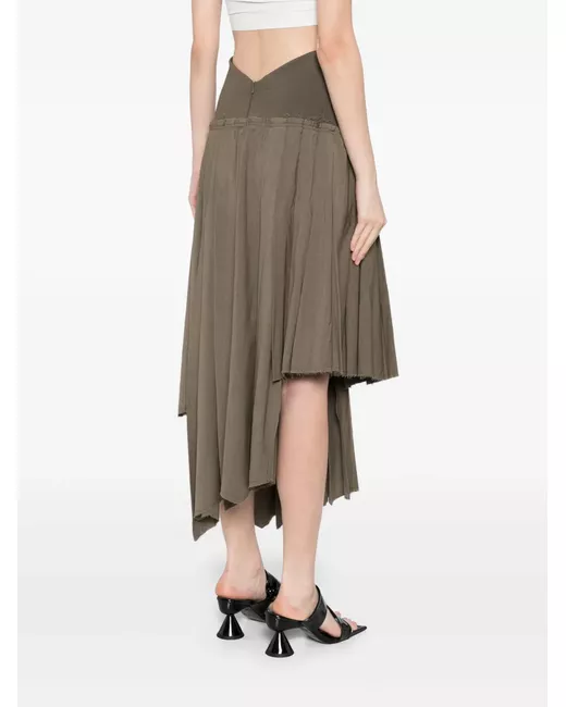 khaki green ribbed waistband fully pleated concealed rear zip fastening raw edge asymmetric hem