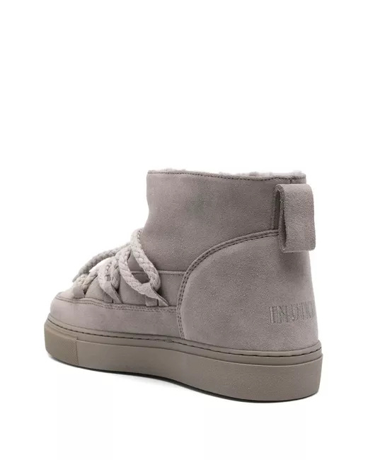 taupe grey calf suede embroidered logo pull-tab at the heel ankle-length front lace-up fastening almond toe flat rubber sole