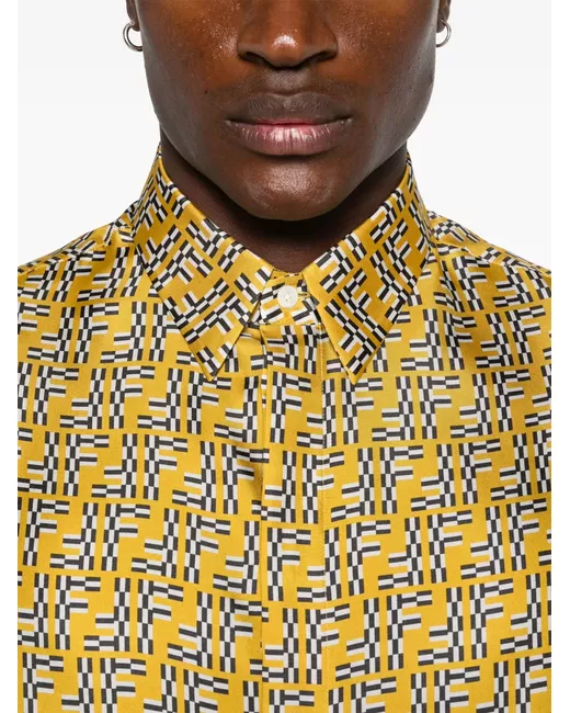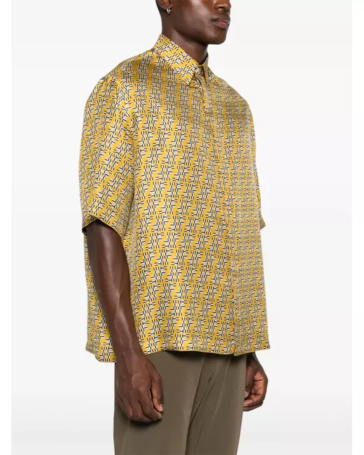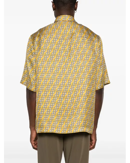 amber yellow silk twill weave satin finish FF Labyrinth jacquard concealed front button fastening classic collar short sleeves straight hem