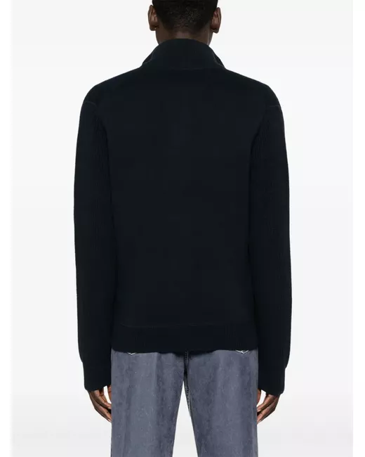 navy blue organic cotton-virgin wool blend cable knit felted finish front two-way zip fastening high neck long sleeves ribbed cuffs and hem two side welt pockets straight hem