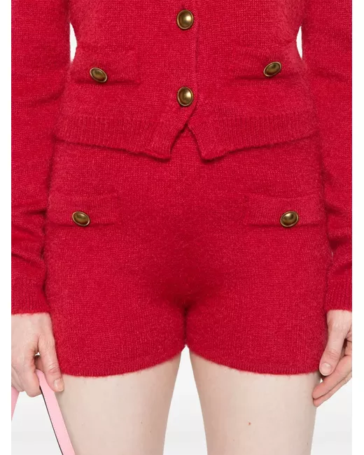 red knitted construction high waist elasticated waistband faux pocket detail decorative button detailing slim cut thigh-length