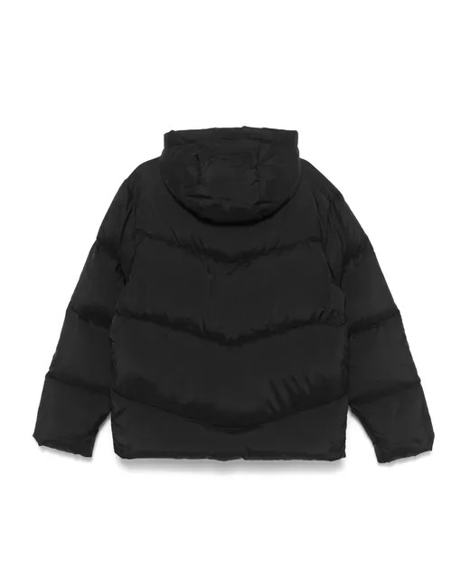 black textured finish quilted front two-way zip fastening padded design duck down blend filling classic hood long sleeves elasticated cuffs logo print at the chest two side zip-fastening pockets straight hem