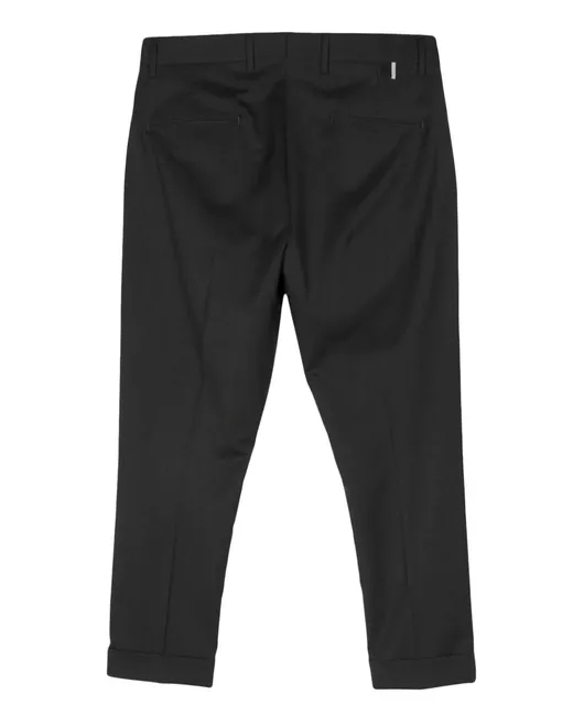 dark grey virgin wool blend interlock twill weave concealed front button, hook and zip fastening mid-rise belt loops coin pocket pressed crease two diagonal pockets to the sides dart detailing two rear jetted pockets turn-up hem cropped leg