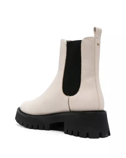 cream white calf leather pebbled texture pull-on style branded heel counter pull-tab at the heel elasticated side panels round toe branded insole leather lining rubber lug sole