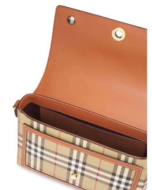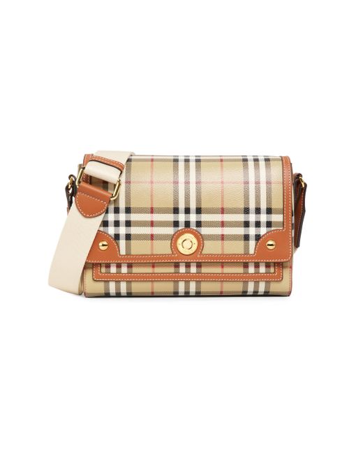 An archive-inspired style in the house's signature check, Burberry's Note bag is detailed with logo-engraved studs. Adjustable, removable crossbody strap Exterior: one front slip pocket Interior: one slip pocket Magnetic closure Polyurethane/polyester/cotton Lining: cotton Trim: leather Made in Italy SIZE About 9.75"W x 7"H x 3.25"D ABOUT THE BRAND Founded in 1856 by 21-year-old Thomas Burberry, the brand set out with a mission to stylishly protect against British weather-and Burberry's iconic trench coat was born. In the 1920s, its renowned check pattern was introduced as the coat's lining. The heritage brand now offers handbags, beauty and kids' ready-to-wear, and under Creative Director Daniel Lee, the brand continues to evolve and create timelessly classic pieces. Handbags - Burberry Handbags > Burberry > Saks Fifth Avenue > Barneys. Burberry. Color: Briar Brown.