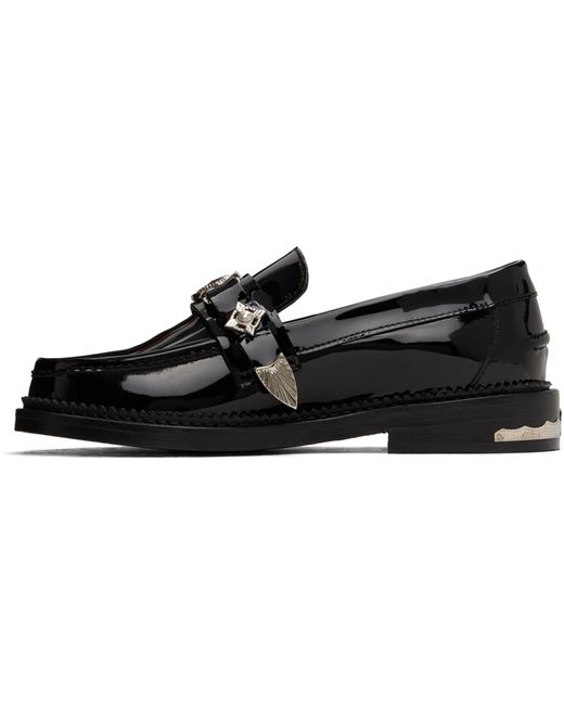 Patent leather loafers in black. Signature silver-tone hardware at vamp and heel. · Moc toe · Strap at vamp · Suede and buffed leather lining in beige · Serrated detailing at welt · Stacked leather heel with rubber injection · Leather sole Supplier color: Black patent