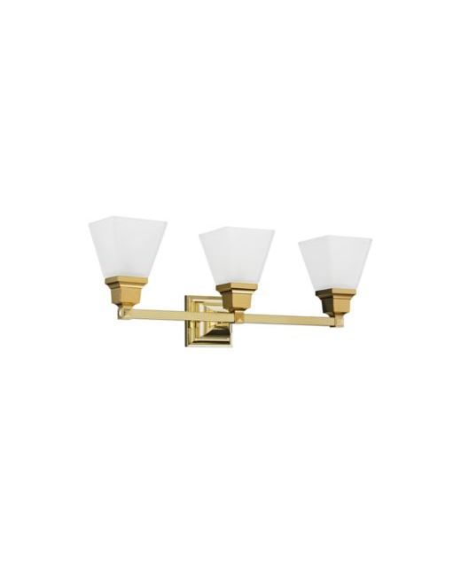 Crisp lines and square bar-style arms distinguish the handmade Mission bath light by Livex. Three upturned, satin glass lights are complemented by the frame's polished brass-tone finish.