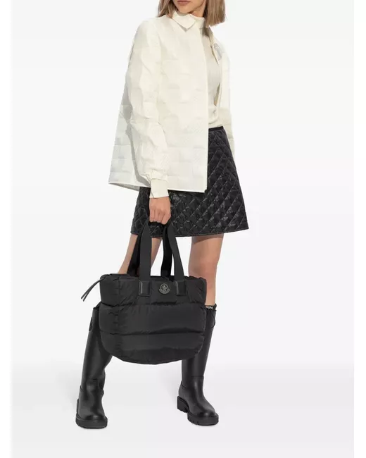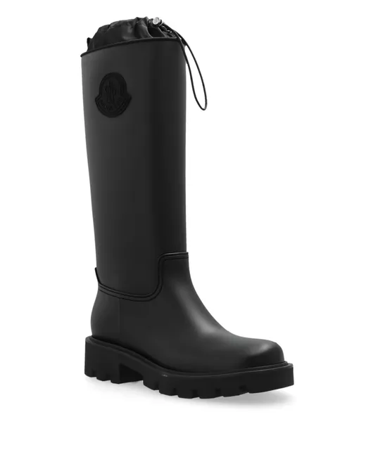 black faux leather semi-matte finish panelled design embossed logo to the side round toe knee-high top drawstring fastening logo pull-tab chunky rubber lug sole