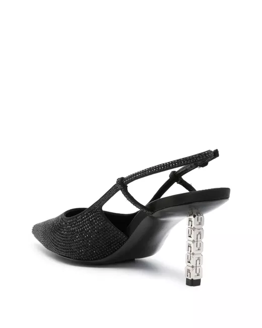 black calf leather rhinestone embellishment pointed toe buckle-fastening slingback strap branded leather insole signature G Cube high stiletto heel