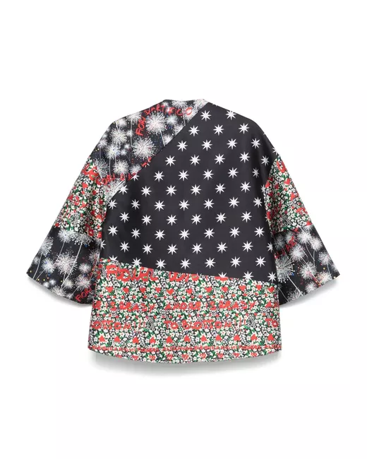 black/multicolour twill weave mix print crossover neck drop shoulder half-length sleeves open front full lining straight hem