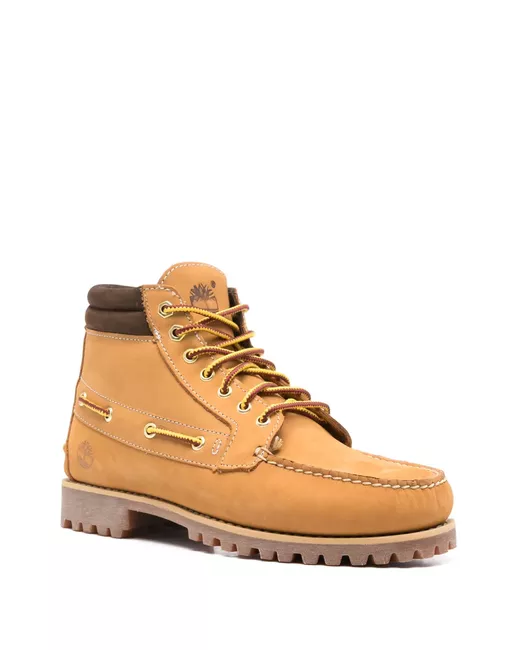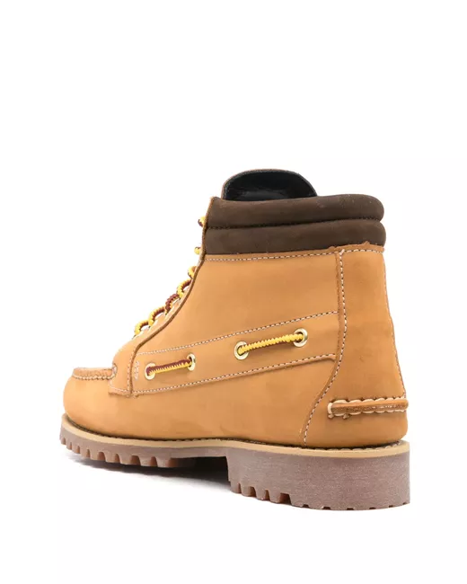 sand beige calf suede front lace-up fastening ankle-length whipstitch trim debossed logo to the side logo-debossed tongue moc stitching round toe branded insole leather lining rubber lug sole