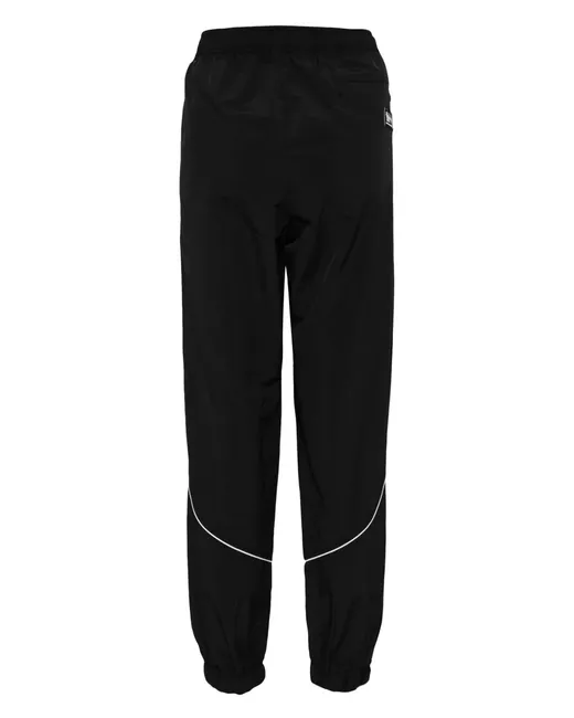 black elasticated waistband front press-stud and zip fastening two side slash pockets panel detailing piped-trim detailing elasticated hem rear welt pocket logo-embossed patch to the rear relaxed fit