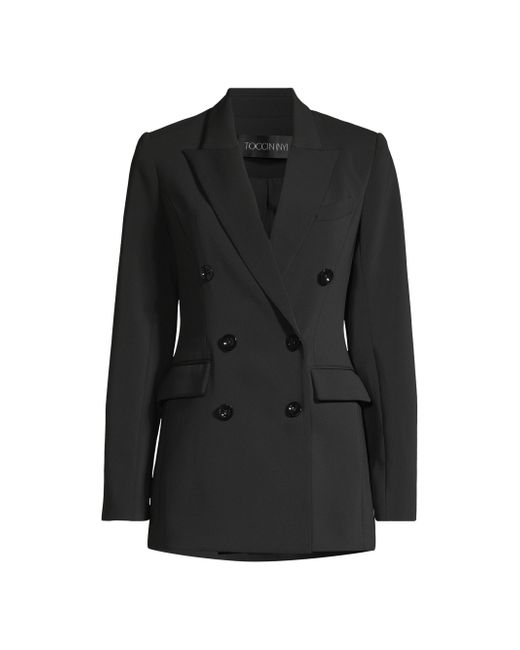 Cut in a double-breasted silhouette, Toccin's Mia blazer is styled with a welt chest pocket and side flap pockets. Peak lapels Long sleeves Chest welt pocket Side flap pockets Double-breasted button-front closure 96% polyester/4% spandex Dry clean Imported SIZE & FIT About 30" from shoulder to hem Model measurements: 6'1" tall Model is wearing a US size 4. Modern Collections - Branded Separates > Toccin > Saks Fifth Avenue > Barneys. Toccin. Color: Jet. Size: 0.