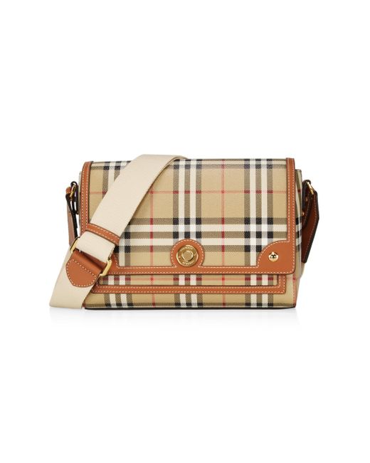 Crafted in Italy, Burberry's Note crossbody bag features the brand's iconic check pattern and goldtone hardware. The bag is designed with an adjustable, removable strap and a snap-flap closure. Adjustable, removable crossbody strap Snap-flap closure Two inside slip pockets Polyurethane, polyester, and cotton Cotton lining Leather trim Made in Italy SIZE 9.75"W x 7"H x 3.25"D ABOUT THE BRAND Founded in 1856 by 21-year-old Thomas Burberry, the brand set out with a mission to stylishly protect against British weather-and Burberry's iconic trench coat was born. In the 1920s, its renowned check pattern was introduced as the coat's lining. The heritage brand now offers handbags, beauty and kids' ready-to-wear, and under Creative Director Daniel Lee, the brand continues to evolve and create timelessly classic pieces. Handbags - Burberry Handbags > Burberry > Saks Fifth Avenue > Barneys. Burberry. Color: Briar Brown.
