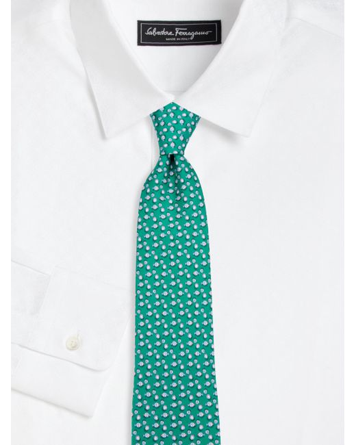 Crafted of luxe Italian silk, FERAGAMO's Vanda tie showcases a charming fish and ball print. 100% silk Dry clean Made in Italy SIZE About, 58"L x 3"W ABOUT THE BRAND Italian designer Salvatore Ferragamo began his journey in 1927 with a vision of creating the world's most beautiful shoes. The label expanded to menswear in the 1970s, and remains famed for its made-in-Italy pieces. The craftsmanship inherent in its shoes is also found in accessories like sunglasses, belts and ties. The brand's signature Gancini logo-a backwards horseshoe-can be found on its classic loafers and fine leather goods. Men Luxury Coll - Designer Neckwear > Ferragamo > Saks Fifth Avenue > Barneys. FERRAGAMO. Color: Green.