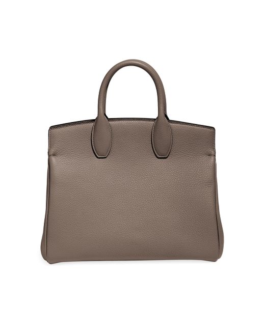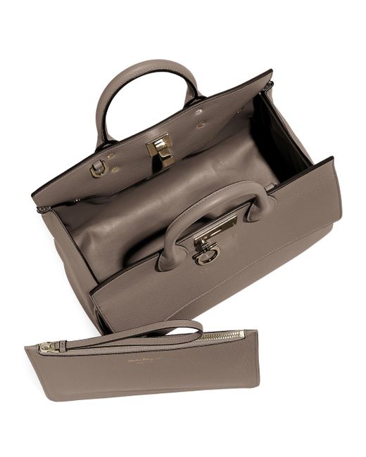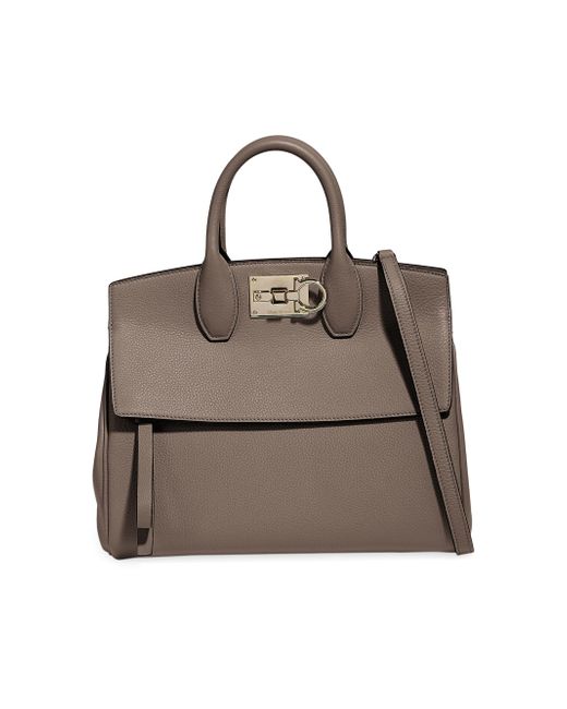 Structured small top handle bag crafted of a smooth Italian leather. Removable, adjustable strap Top handle Turnlock flap closure Goldtone hardware Interior removable zip pouch Metal feet Dust bag included Leather lining Leather Made in Italy SIZE 11.5"W x 9.75"H x 5.5"D ABOUT THE BRAND Italian designer FERRAGAMO began his journey in 1927 in Italy with a vision of creating the world's most beautiful shoes. Since its inception, FERRAGAMO has expanded to include clothing, accessories and beauty under the creative direction of Maximilian Davis-who brings a minimalist-meets-maximalist aesthetic to the brand. Handbags - Ferragamo Handbags > Ferragamo > Saks Fifth Avenue > Barneys. FERRAGAMO. Color: Caraway.