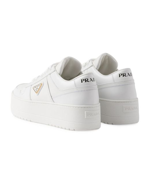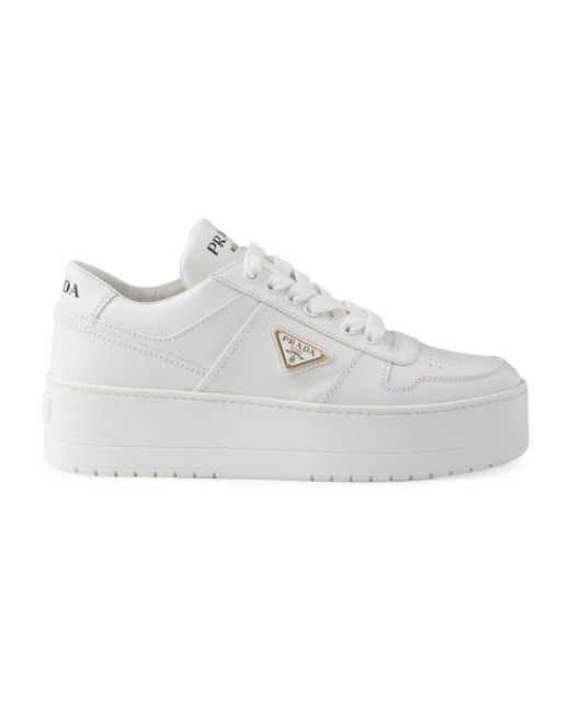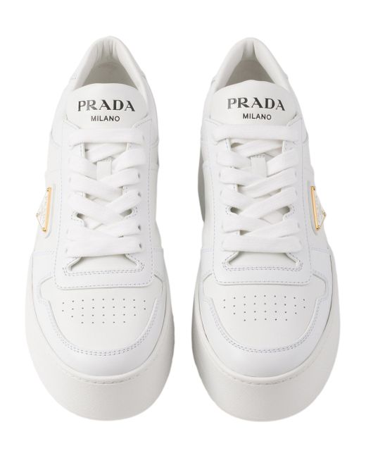 Inspired by basketball sneakers of the '80s, these Downtown Bold sneakers have a sporty design with refined details. The shoes made of perforated leather are reinterpreted with flatform soles that give the style a distinctive, contemporary character. Different interpretations of the Prada logo decorate the shoe, completed with the iconic geometric shape of the enameled metal triangle. Upper with perforations Leather lining Enameled metal triangle logo Laces closure Rubber sole, 50 mm / 1.9'' Tread with geometric lines Removable leather-covered insole Imported. Lsd Rtw - Prada Rtw > Prada > Saks Fifth Avenue > Barneys. Prada. Color: White. Size: 9.