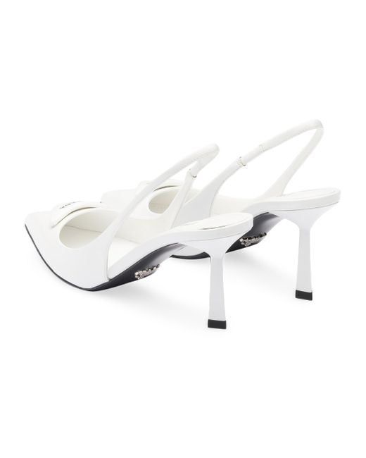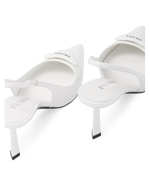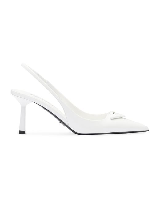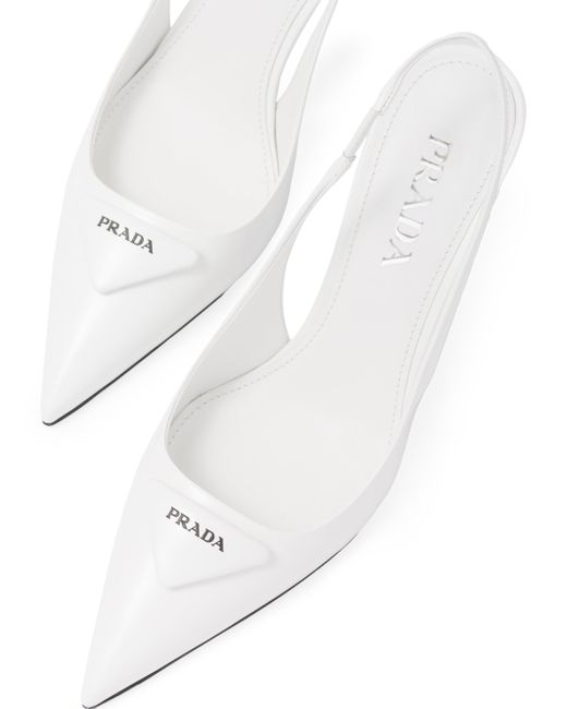 These pumps expressing sophisticated, feminine elegance are made of brushed leather, an emblematic material of Prada since the 90s traditionally used for luxury footwear. The triangle logo returns as a slightly padded leather detail and inspires the geometric line of the heel, which gives the silhouette a modernist note. Screen-printed leather triangle logo Leather sole with metal lettering logo 75mm (2.9'') varnished heel Imported. Lsd Rtw - Prada Rtw > Prada > Saks Fifth Avenue > Barneys. Prada. Color: White. Size: 5.