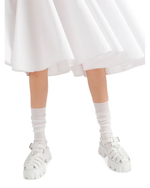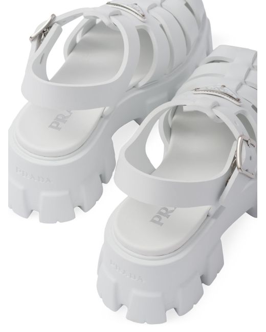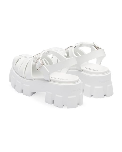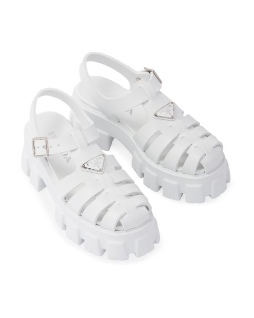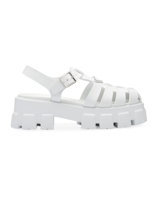 The chunky yet lightweight design of the iconic Monolith sole made of rubber is an expression of a timeless design, monolithic and unique, that reimagines Prada's dual soul with a modernist twist. Made of rubber for a fun, contemporary look, the silhouette reinterprets retro beach footwear in a totally new way that reflect Prada's hybrid soul. Upper with metal buckle Enameled metal triangle logo Rubber sole: 55mm / 2.1'' Fabric pouch not included in the packaging Made in Italy. Lsd Rtw - Prada Rtw > Prada > Saks Fifth Avenue > Barneys. Prada. Color: White. Size: 5.