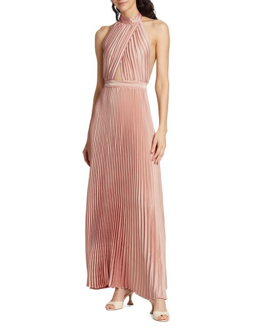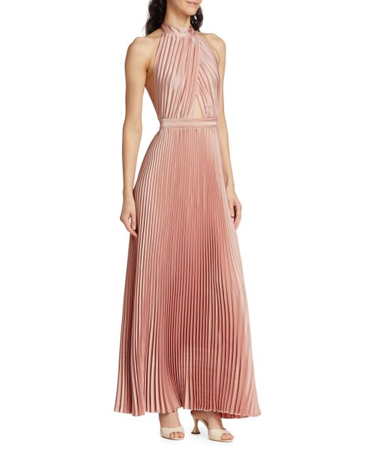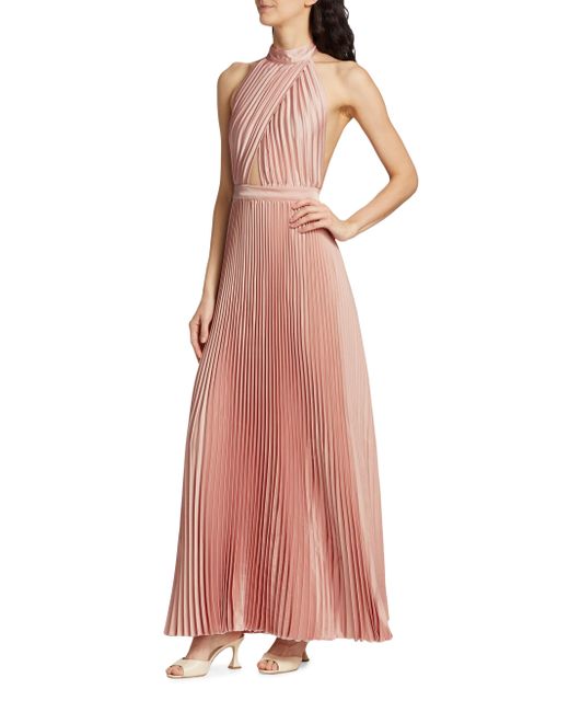 Woven from lustrous satin, L'IDÉE's high-neck Renaissance gown boasts a plissé-pleated outer and sleek open back. High neck, self-tie closure Sleeveless Chest cut-out Banded waist Open back Concealed back zip closure 100% polyester Hand wash Imported SIZE & FIT About 51" from topline to hem Model measurements: 5'10" tall Model is wearing a US size 4. Contemporary Sportswear - Trend > L'idée > Saks Fifth Avenue > Barneys. L'Idée. Color: Ballet. Size: 2.