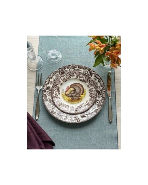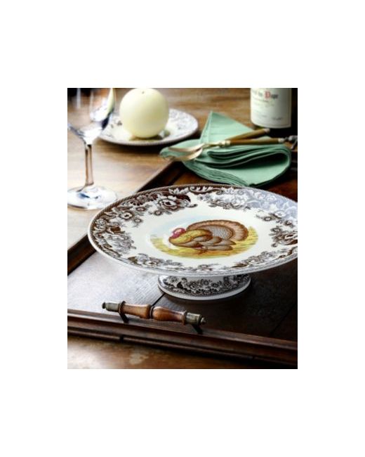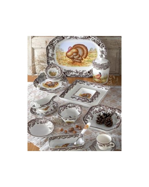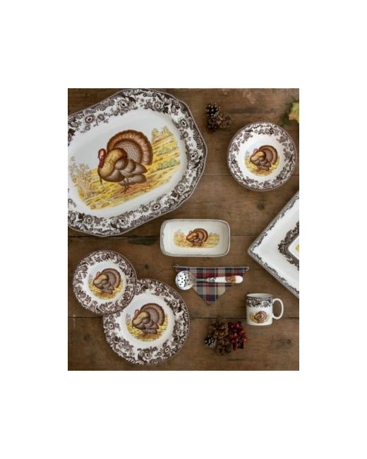 Bring the classic style of the English countryside to your table with the Woodland cranberry dish and slotted spoon set by Spode, featuring a majestic turkey framed by the brand's distinctive British Flowers border.