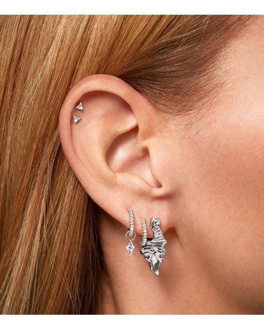 More than a jewellery designer, MARIA TASH is a master of illusion, adorning the ear with precious gems that appear to be floating atop the skin. The secret behind this stud earring's gravity-defying effect? An invisible setting in which the triangle diamond is held in place by intricately designed prongs pushed by precision setters.