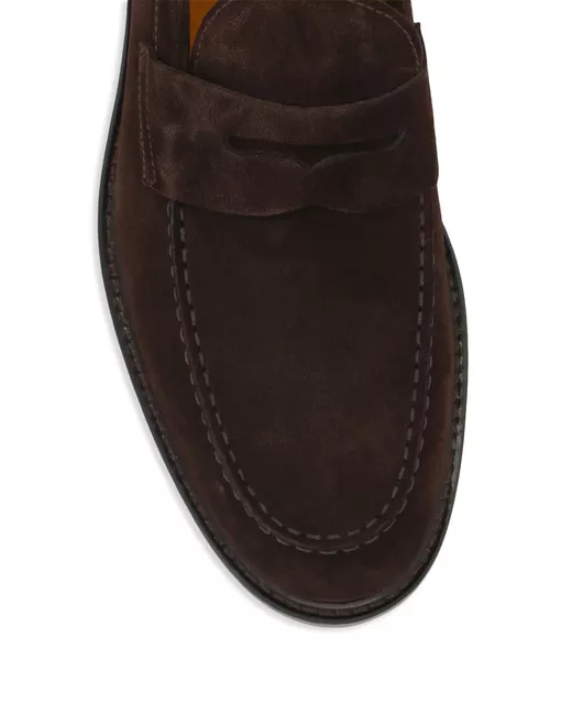 coffee brown calf suede slip-on style low block heel penny slot almond toe branded leather insole rubber sole