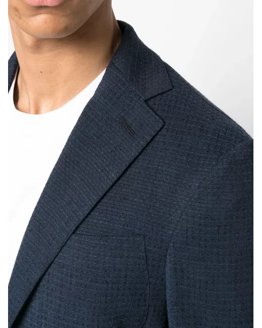 dark blue notched lapels front button fastening chest patch pocket two side patch pockets straight hem English rear vents