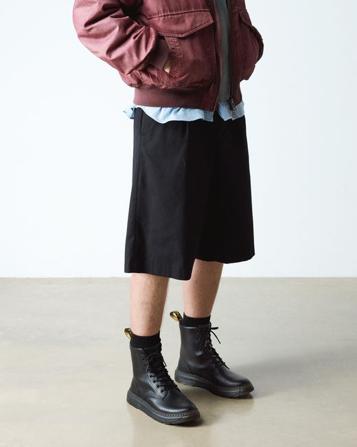 Utilitarian comfort. Our new Crewson boot unites our heritage silhouette and markings in one of our lightest constructions to date. Inside and out, the boot is engineered with functionality in mind: from the newly evolved tooling and lightweight Crewson outsole to the internal Soft Wair insock providing instant, everyday comfort. Other echoes of DM's DNA come through in the yellow stitching, Air Wair heel loop and Dr. Martens deboss branded tongue patch. Classic Pull Up is a satin-finish leather with a subtle pull up. Clean with a damp cloth and care with Dr. Martens Wonder Balsam. Our lightest air-cushioned sole yet. The Crewson sole fuses EVA and PVC in a new utilitarian construction. Comfortable padding around the ankle. Dr. Martens Men's Crewson Leather Lace Up Boots in Black, Size: 3