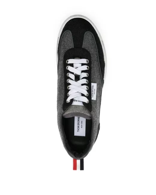 black/multicolour calf leather/virgin wool panelled design almond toe front lace-up fastening logo tag pull-tab at the heel flat rubber sole