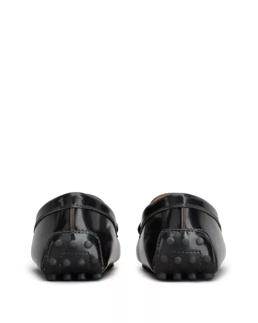 black calf leather patent finish silver-tone hardware tonal stitching apron toe square toe signature Gommino sole rubber sole