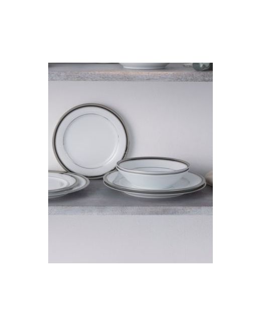 Austin Platinum brings sophisticated elegance to the table. This stunning pattern features crisp bright white porcelain, paired with chic black and platinum bands. The 2 black bands are polka-dotted and solid, and the exterior platinum band is etched with an infinite scroll design.