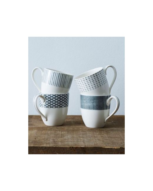 Crisp white with subtle mottled hues creates the eclectic ambiance of the Noritake Hammock assorted mug set. Each features a deep border of small dots, large dots, stripes, or solid color.