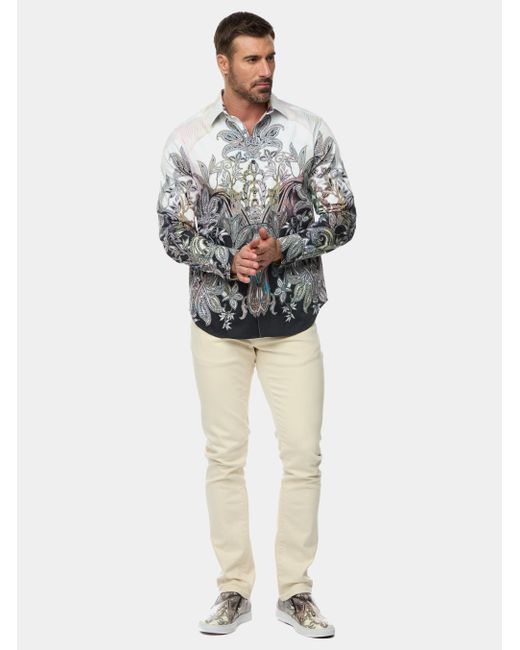 Turn heads with the Kincade, a statement piece that shows off your unique style. This eclectic design features a bold paisley print that explodes with vibrant neon accents. Exquisite metallic embroidery elevates the look, showcasing the style's craftsmanship. No matter the occasion, this piece will surely steal the show. Point collar Full button front placket Metallic embroidered details Jacquard detail at back yoke Contrast print at cuff Long sleeve Button cuff Shirttail hem 97% cotton, 3% spandex Machine wash cold Imported