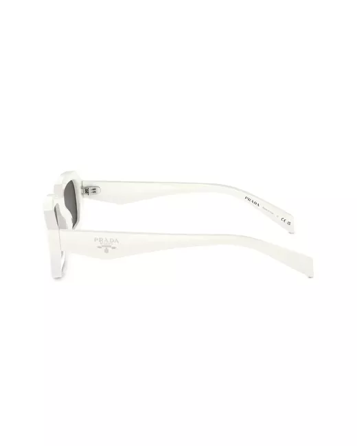 white acetate silver-tone logo lettering at the arm rectangle frame grey tinted lenses straight arms curved tips These glasses come with a protective case.