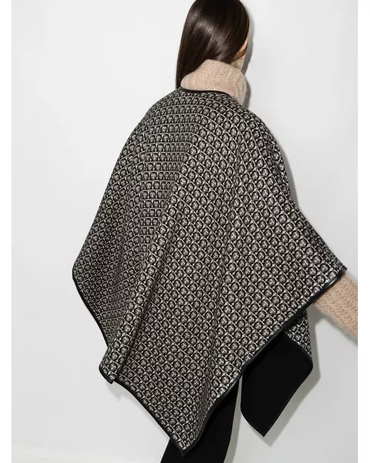 Black wool Gancini wool cape from Ferragamo featuring Gancini print, handkerchief hem, leather trim and wrap design.