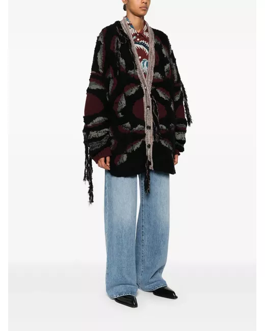 black/multicolour wool blend chunky knit distressed effect front button fastening patterned jacquard V-neck drop shoulder long sleeves ribbed cuffs two side patch pockets straight hem