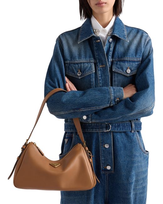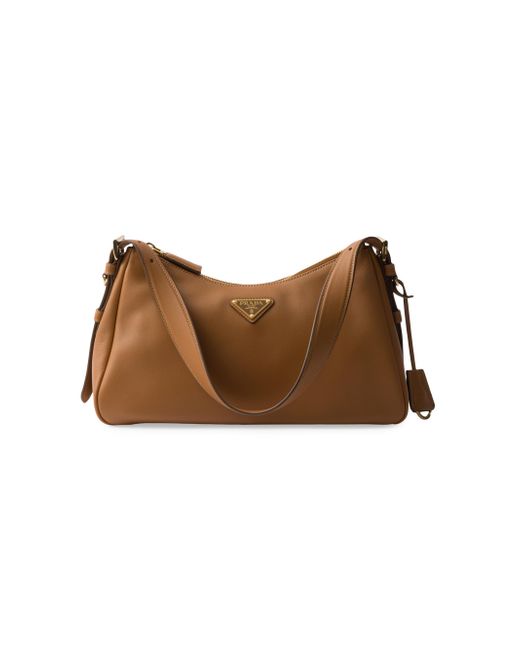 The sophisticated minimalism of the '90s inspires the new Prada Aimée bag, portrayed in the Fall/Winter 2024 Campaign. The design evokes the instinctive gesture of holding a bag with its soft silhouette, created for effortless wear on the shoulders or cross-body. Leather handle Removable key holder Metal hardware Enamelled metal triangle logo on the front Zipper closure Nappa leather interior with two pockets, including one with zipper closure 100% Calf leather 31W x 18H x 10L cm / 12.2W x 7H x 3.9L in. Imported. Lsd Handbags - Prada Handbags Access > Prada > Saks Fifth Avenue > Barneys. Prada. Color: Brown.