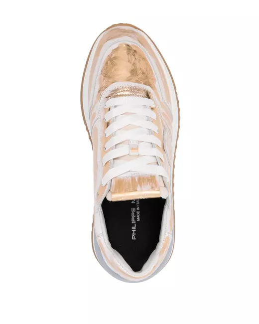 white/light orange calf leather brushstroke print metallic effect round toe logo patch to the side logo patch at the tongue branded heel counter padded ankle removable branded insole flat rubber sole with 3D detailing front lace-up fastening