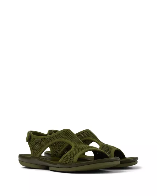 olive green mesh design logo patch to the side torchon piping detail round open toe slingback strap branded leather insole flat rubber sole