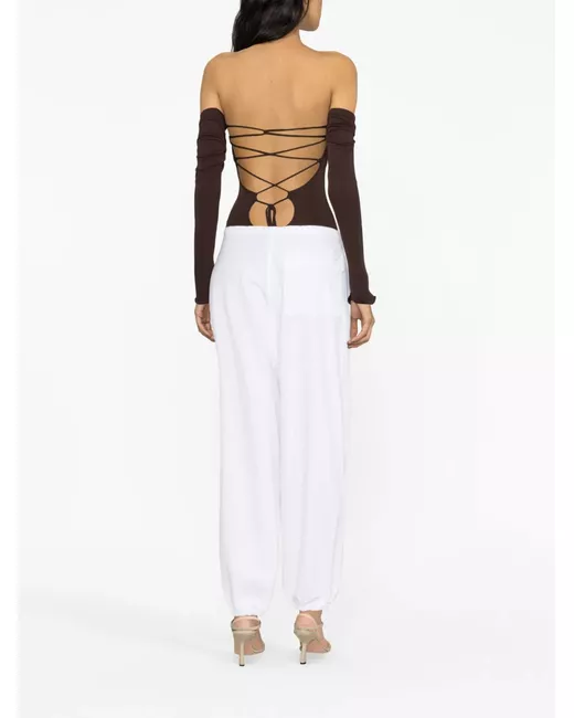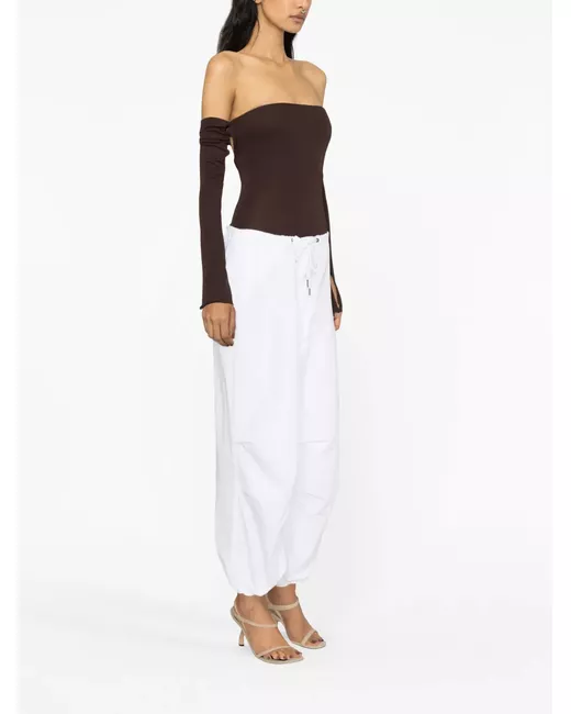 white cotton drawstring waist two side flap pockets rear flap pocket drop crotch wide leg drawstring cuffs silver-tone hardware