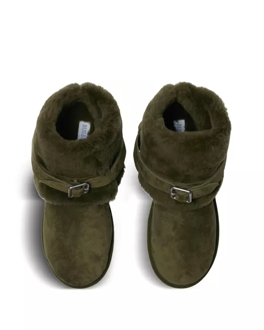moss green shearling calf suede panelled design strap detailing round toe ankle-length front buckle fastening flat sole