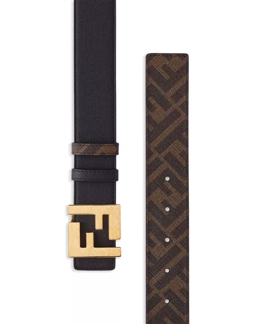 black leather grained texture FF motif logo-buckle fastening gold-tone hardware reversible punched holes