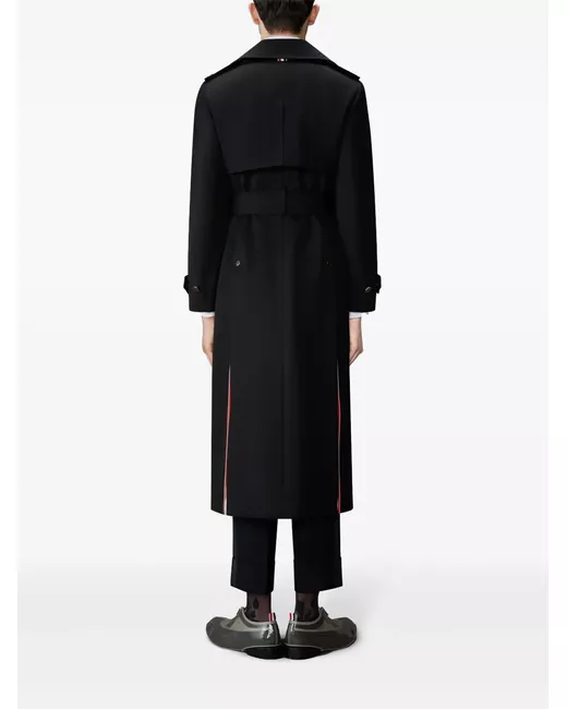 black double-breasted button fastening notched lapels two front flap pockets belted waist pleat detailing decorative button detailing belted cuffs
