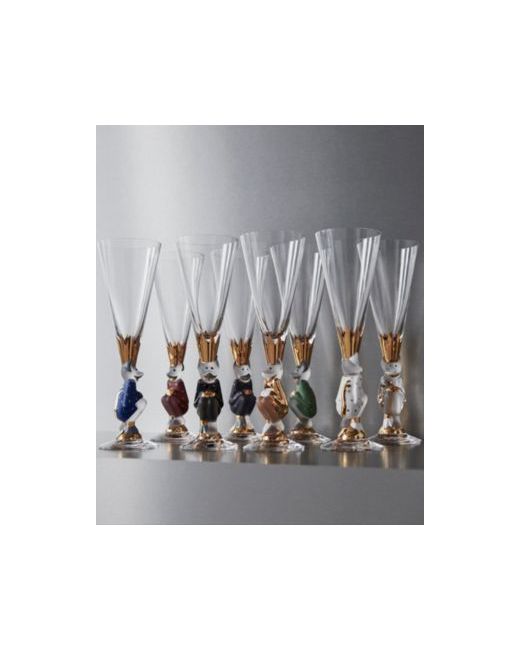After Gunnar Cyren's passing in 2013, his sons found several sketches of champagne glasses inspired by the snap's glasses in the Nobel collection from Orrefors. The selected design has resulted in luxurious stemware glasses in different color variations. The Sparkling Devil in blue is mouth-blown in Sweden with hand-painted details in real 21 karat gold.