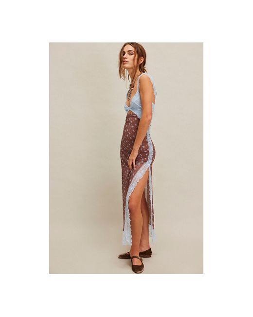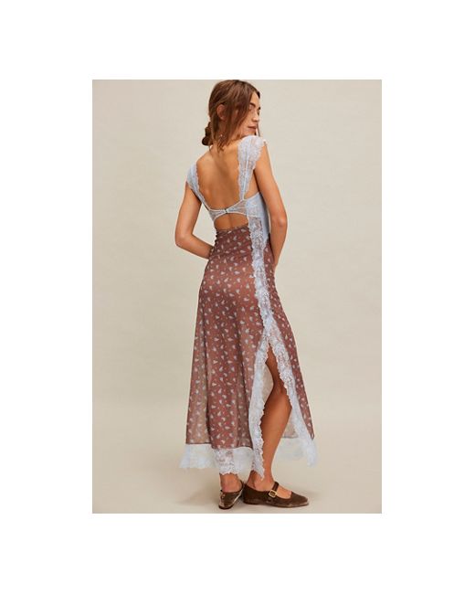 Slip into this sultry maxi featuring a sweetheart-neckline and bold back cutout with side-slit detailing. **Fit:** Formfitting throughout the body, maxi-length **Features:** Sheer mesh with floral print detail, lace detail throughout with scallop trim, front cutout at bust, sweetheart-neckline, cap-inspired sleeves, side-slit detailing, back-hook closure with cutout **Why We Suddenly Fine Maxi Slip by Intimately at Free People in Cafe Combo, Size: XS