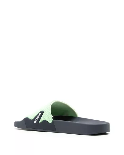 Astra logo slides from RAF SIMONS featuring dark grey, mint green, textured finish, logo plaque, embossed logo to the side, single toe strap, open toe, moulded footbed and flat rubber sole.