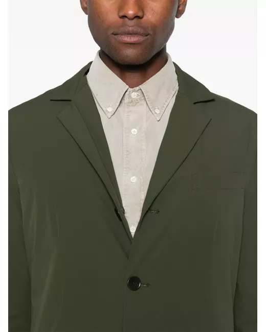 olive green technical jersey stretch-design notched lapels front button fastening long sleeves chest welt pocket two front flap pockets straight hem