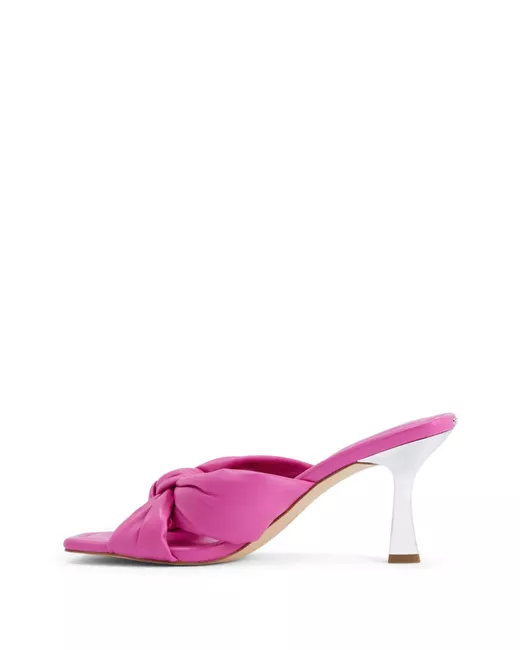 pink leather crossover strap detail tonal stitching square open toe branded leather insole rubber sole mid sculpted heel slip-on style