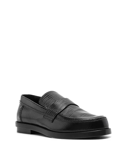 black calf leather embossed lizard-skin effect round toe strap detailing branded insole leather lining low stacked heel leather sole slip-on style We've partnered with Good On You — an independent agency that rates how brands perform in relation to their impact on the planet, people and animals, with a multi-criteria rating simplified to a five points scale. In order to be awarded our conscious label, larger brands need to score a minimum of four out of five ('Good'), while smaller brands must score at least three out of five ('It's A Start'). This item comes from a brand rated three out of five ('It's A Start') by Good on You at the time it was added on FARFETCH. Please note, this is a brand-level rating and does not guarantee that this product is made with conscious materials. Learn more about what makes a product Conscious on our Conscious Criteria page